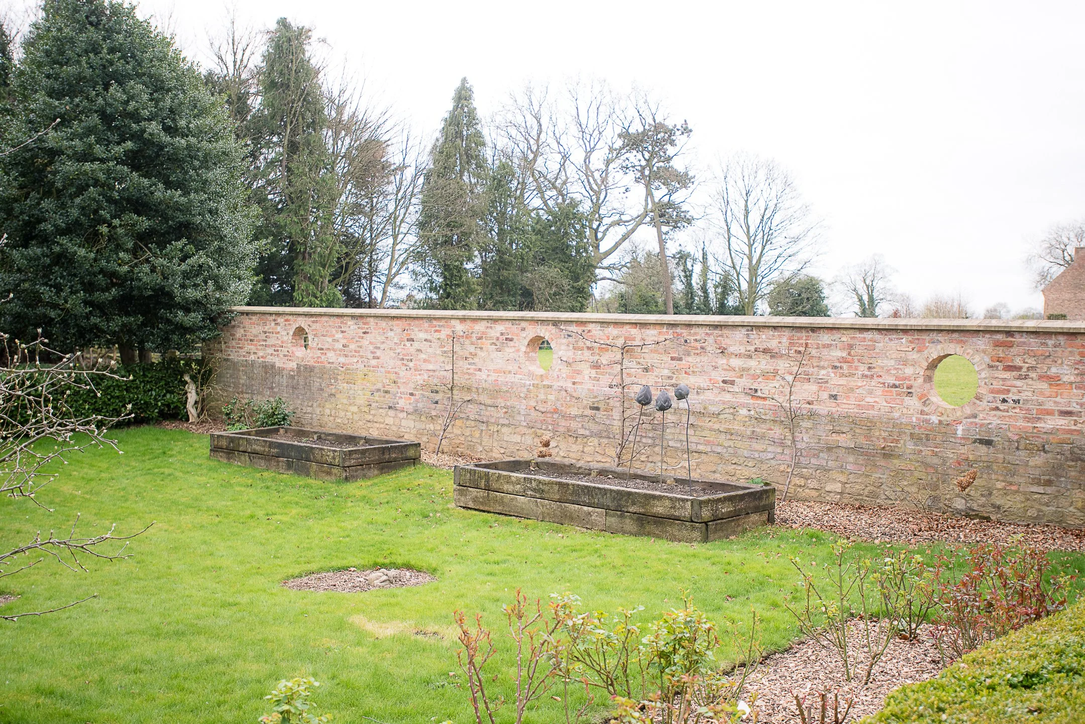 In the garden, raised beds were built and the secret walled garden wall was raised and built with the added twist of creative portholes.
