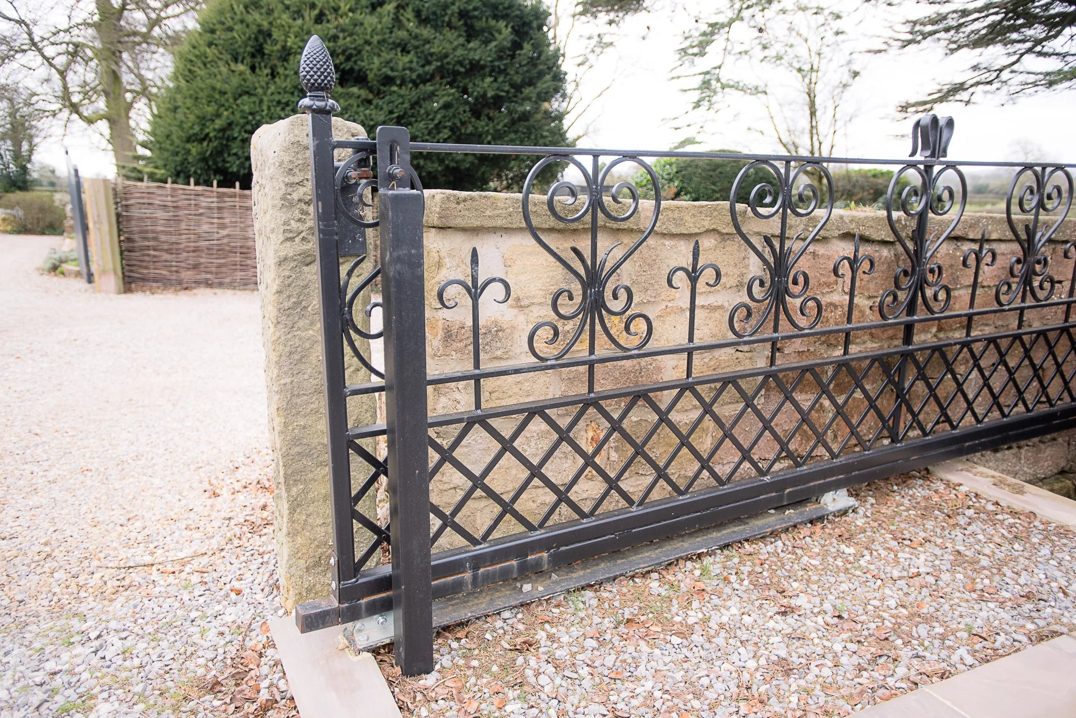 The ornate sliding gate was fabricated and installed by our sister company Hutchinson’s Fabrications Ltd.